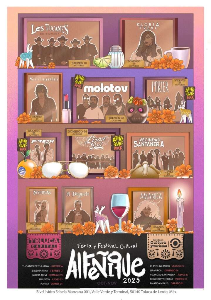 La edición número 56 de la Feria y Festival Cultural del Alfeñique se celebrará del 1 de octubre al 5 de noviembre de 2025 en Toluca, Estado de México. Incluye conciertos estelares en la explanada del Mercado Juárez, así como una agenda descentralizada que abarcará mercados, delegaciones, espacios públicos y recorridos culturales.